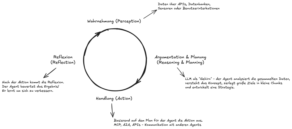 Bevor wir in die einzelnen Komponenten eintauchen, müssen wir das grundlegende Funktionsprinzip verstehen. Jeder KI-Agent operiert in einem kontinuierlichen Kreislauf, der sein “Betriebssystem” darstellt. Dieser Zyklus ermöglicht es ihm, zu lernen und sich anzupassen: