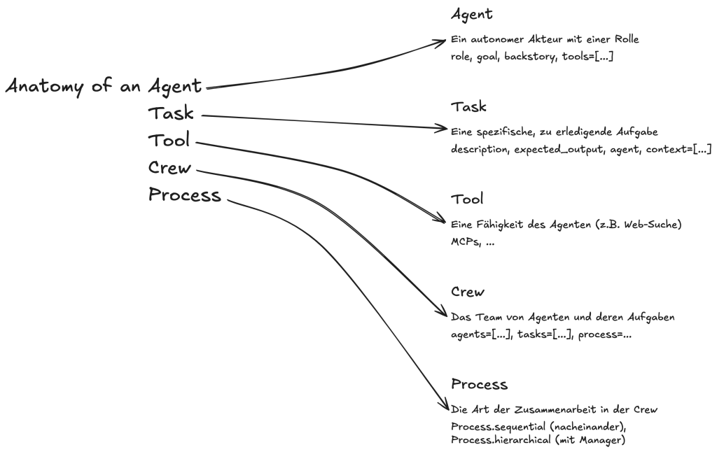 Tasks | Die einzelnen Arbeitsaufträge. | Jede Task hat eine klare description und ein expected_output . Sie wird einem spezifischen Agenten zugewiesen. |